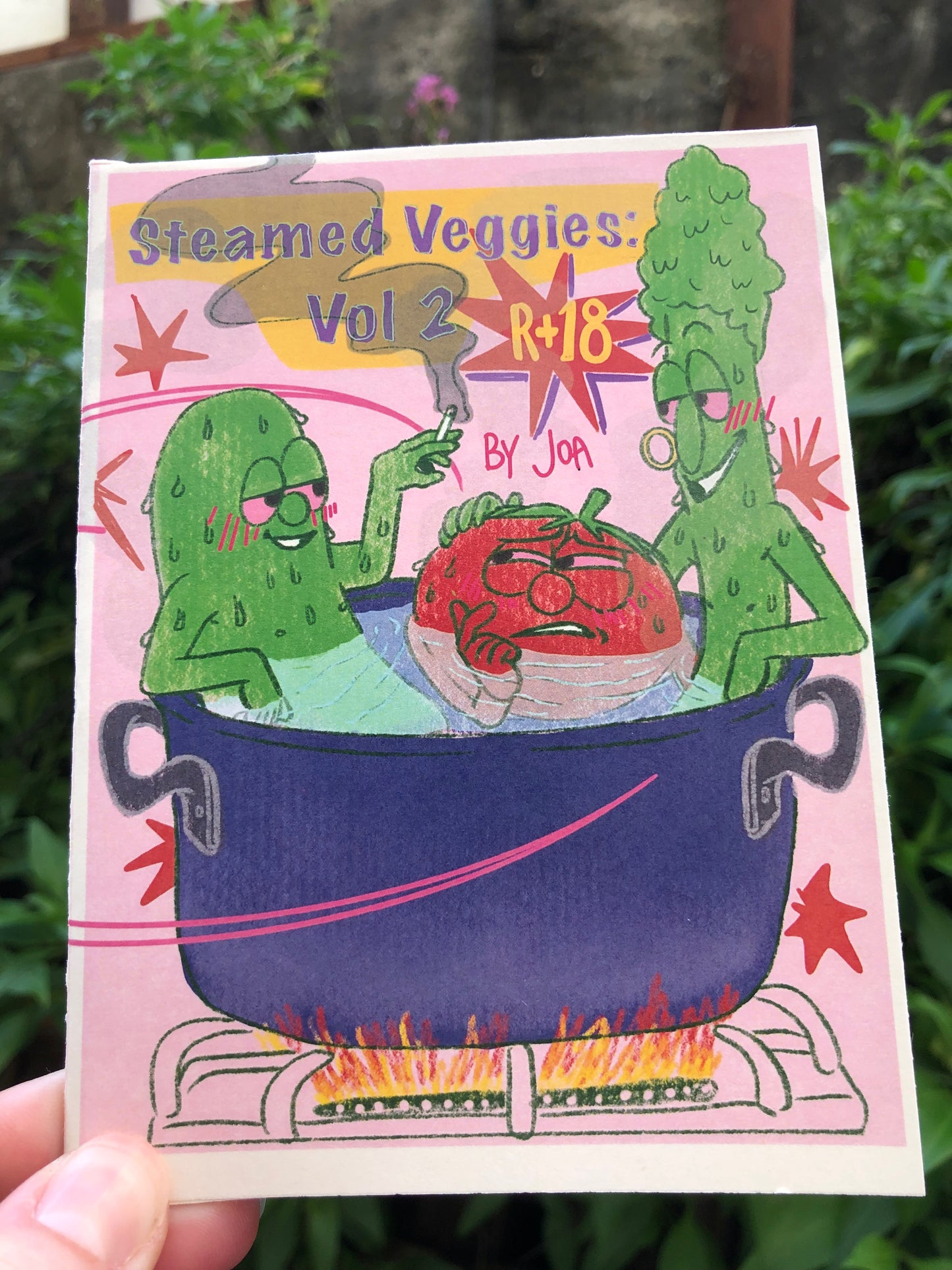 Steamed Veggies: An Erotic Veggie Tales Fanzine is an 8-fold full color zine on ivory card-stock paper.