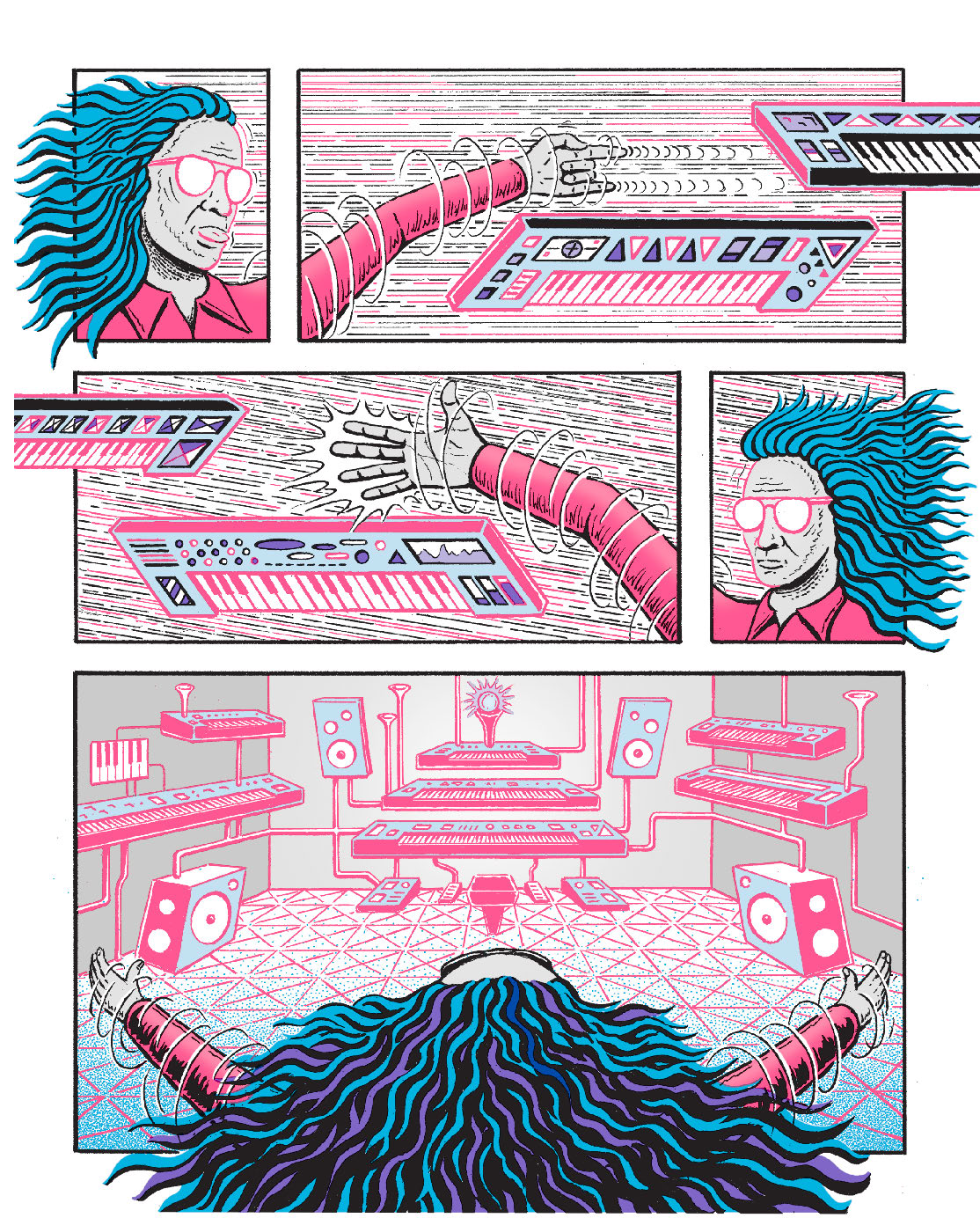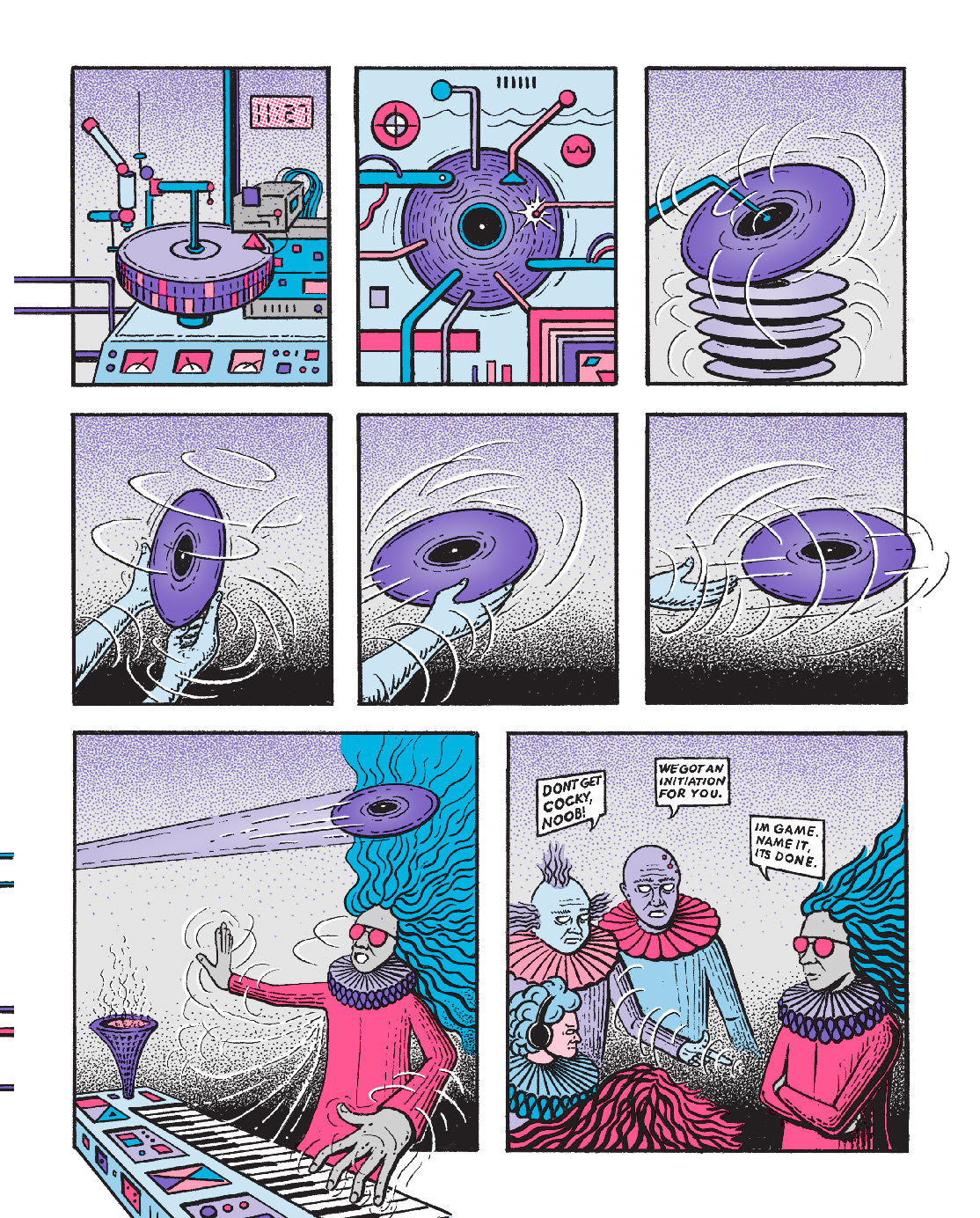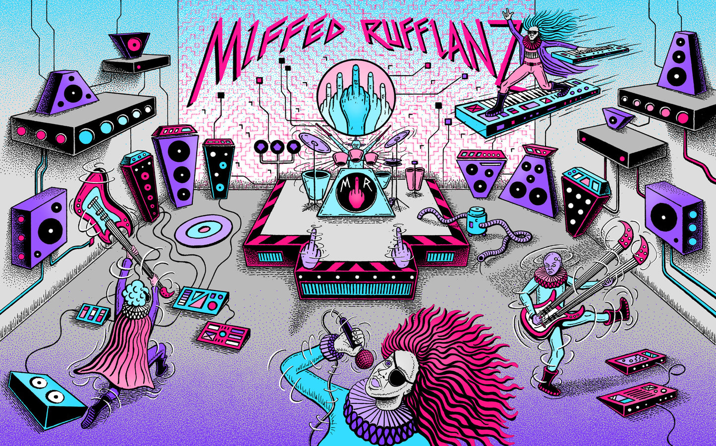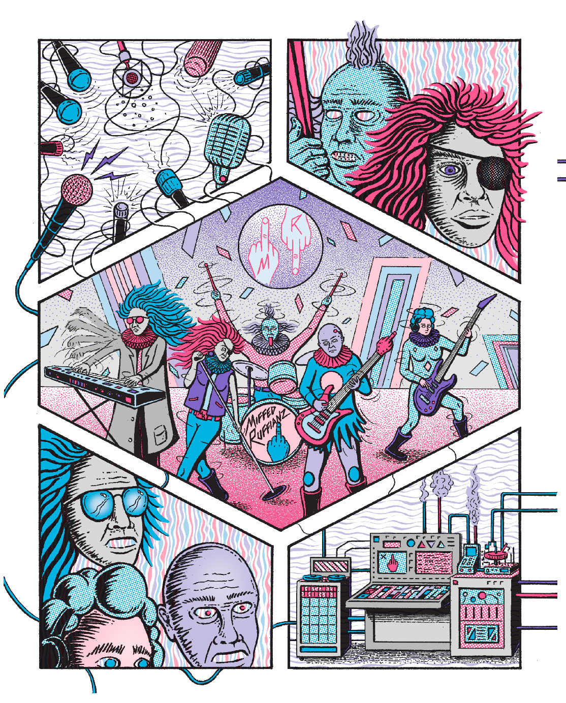 Master of psychedelic mechanics Rodger Binyone presents Miffed Ruffianz: 32 neon Pantone pages following the blazzzed up, burned out, over-medium Sci-Fi Punk Maniacz taking the localz by storm. Retro-future rock band shredz & medz it’s way to battle sworn rivalz, laying waste to the Regularz along the way.