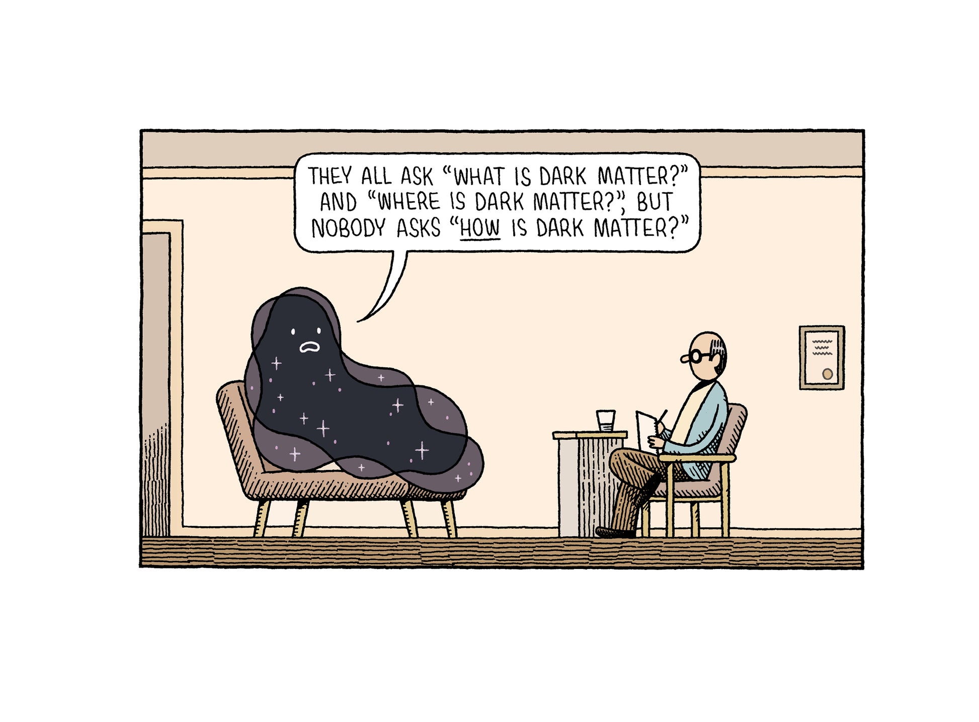 Find out what the hadron’s news alert about CERN says! Everyone asks, “What is dark matter?” and “Where is dark matter?” but do they ever take the time to ask, “How is dark matter?” Based all on previous data, we can predict with a 99.99% certainty that you will either laugh, guffaw, chortle or snort (we don’t have a large enough sample set to be able to say which particular type of mirth you will experience.)