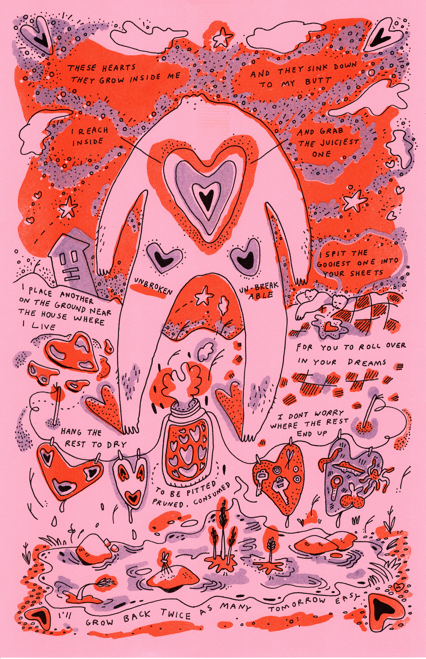 3-color risograph: black,orange,purple on pastel pink paper