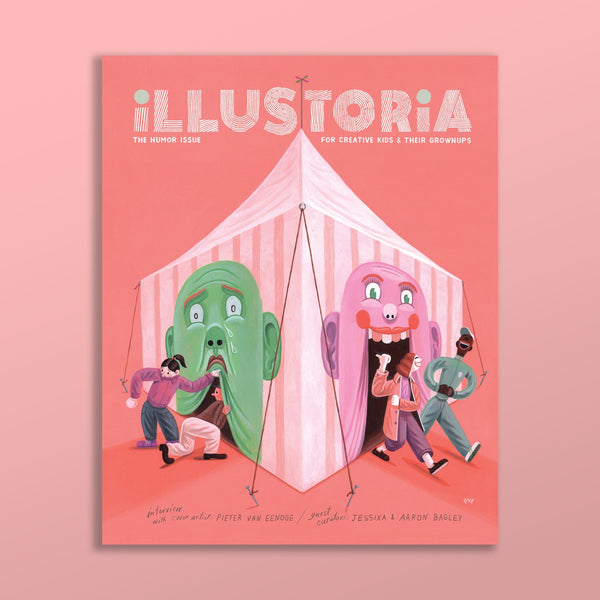 Prepare to laugh, giggle, snicker, and guffaw with Illustoria’s humor Issue! Peppered with riddles and jokes, goofy games and Side-splitting comics. Ponder an age-old question as guest curators Jessixa and Aaron Bagley invite four new artists to explore what exactly IS Funny? Join DogChef in the kitchen with edible balloon animals, and make pop-up un-birthday cards inspired by The Mad Hatter from Alice in Wonderland. Learn about the history of Limericks—hysterical poetry popularized by Edward Lear—and discover the biological purpose of laughter. Plus all the comics, interviews, activities, and youth writing that readers of Illustoria have come to know and love now with an extra-sized helping of the hilarious.