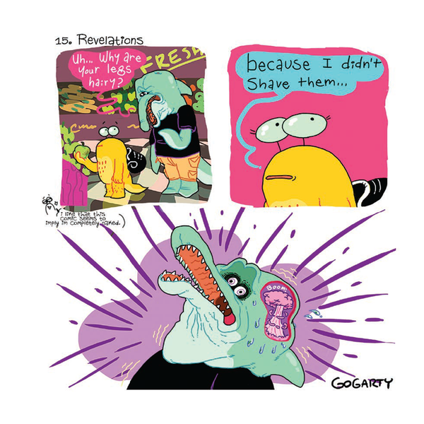 "Gogarty’s art is a seamless joining of opposites. Simple and complex. The adorable with the grotesque. Hilarity with heartbreak. All wrapped up in Gogarty’s vibrant color palette. They are able to balance the above contrasts with their skills in drawing expressions and character design. They can do a great deal of characterization with sparse lines over their snail-self’s eyes and then in the next panel draw an incredibly detailed reaction including eye crusties and wrinkles. Some might find all the details gross, but I find it’s part of the fun." - Rachel Bolton, WWAC