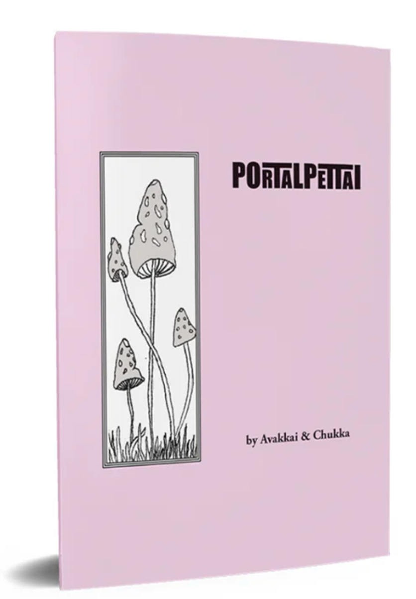 Portalpettai is an illustrated mini-book about an interdimensional portal which opens at a women's college in a small town in Tamil Nadu. It's narrated by a former lecturer at the college who has been transformed into a floating jellyfish-like creature with a see-through head.