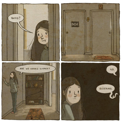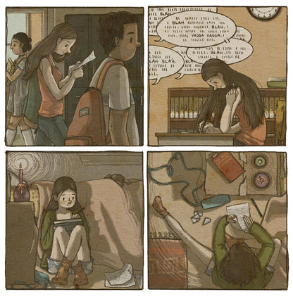Raised By Ghosts is a powerful, affecting graphic novel for young adult readers. The story is told by shifting between Briana’s first-person class notes and diary entries. In her understated yet masterful approach to comics storytelling, Loewinsohn eschews dramatic confrontations and overt sentimentality, preferring instead to underscore the idea that sometimes acceptance and love can be communicated through quiet, everyday moments and close family bonds.