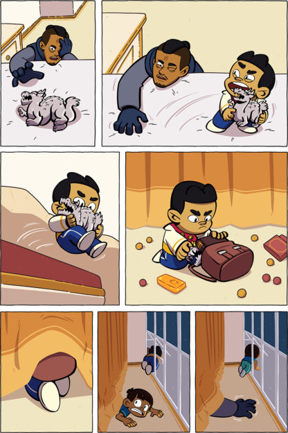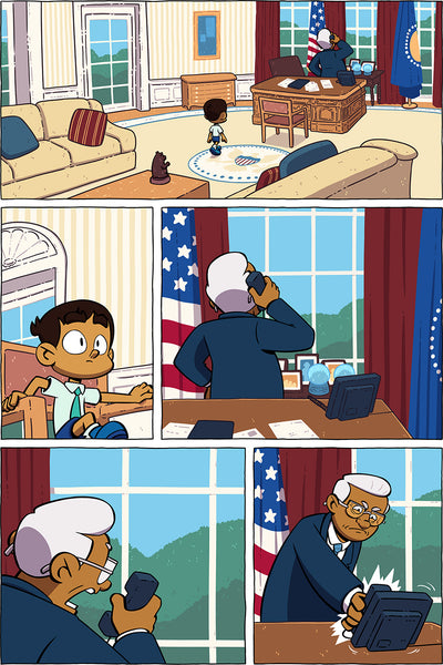 When eight-year-old student ambassador Joseph Bazan wins a photo op with the President of the United States, he doesn’t know quite what to expect, but it certainly isn’t hanging out with the leader of the free world in a secret compartment in the resolute desk! Joseph’s pluck and kid logic not only charm the president, but they soon help resolve a thorny trade dispute. This gives POTUS an idea. Across the ocean, eight-year-old boy king Nang Nukatau III has taken his father’s crown and clumsily stumbled into an international incident, and now Joseph’s got a pressing mission: talk the tiny dictator back from the brink of war!