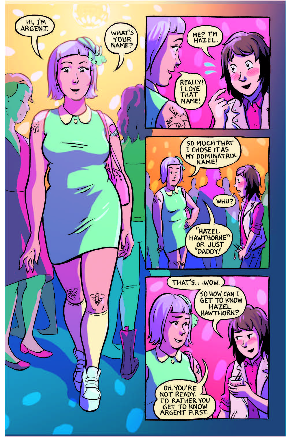 Hazel is already in a happy relationship when she meets Argent, a dominatrix who’s sweet and tender outside of the bedroom. Sugar Town is a fun, colorful comic about a young woman’s journey through the delights and challenges of multiple lovers.