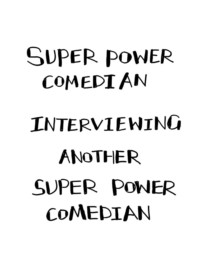 Super Power Comedian Interviewing Another Super Power Comedian is a fictional story set in America in which a young comedian takes an iconoclastic journey to meet her hero, a retiring comedian, coming to terms with her former rival and their disparate career paths.