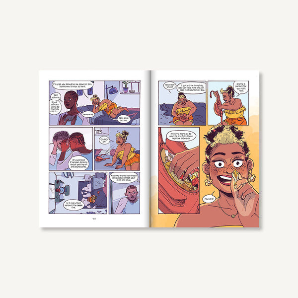 In expanding the story of Kim and her friends, the authors pay tribute to Black sisterhood through portraits of shared, yet deeply personal experiences of Black hair care. From self-care to spilling the tea at an hours-long salon appointment to healing family rifts, the stories are brought to life through beautifully drawn characters and different color palettes reflecting the mood in each story.